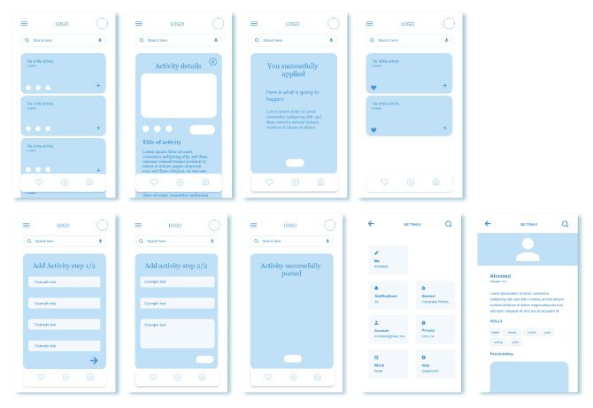 Based on the Crazy 8 sketches and what we learned from the users during the emphasize phase we came up with multiple ideas for the design. Then we created the digital wireframes you will find below: